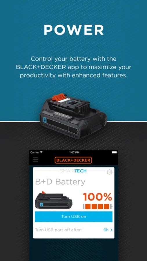You can also connect the BLACK+DECKER™ app to your SMARTECH™ batteries via Bluetooth®. Once connected, you can view the current charge of your battery, turn on or off the USB charging port, enable or disable the battery, and locate your battery when lost.