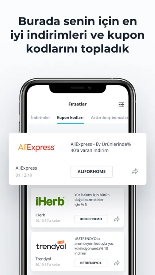 AliExpress’e ilaveten, uygulamamızda giyim, ayakkabı, elektronik ve birçok farklı kategoriden mağaza bulacaksın. Yapman gereken tek şey ilgilendiğin kategoriyi “Mağazalar” sekmesinden seçmek. Mesela “indirimli telefonlar” ile ilgileniyorsan, “Öneriler” sekmesine geçerek “Fırsatlar”a veya “Bonus Artışı”na göz atabilirsin. “Kuponlar” sekmesinde en sevdiğin mağazalardan kupon kodlarına ulaşabilirsin. “Favoriler” sekmesinde en sevdiğin mağazaları bulacaksın.