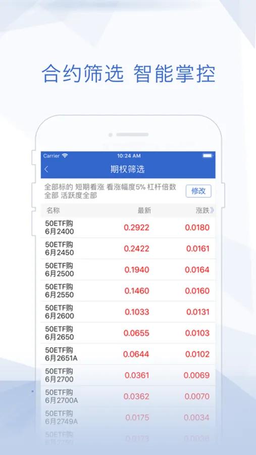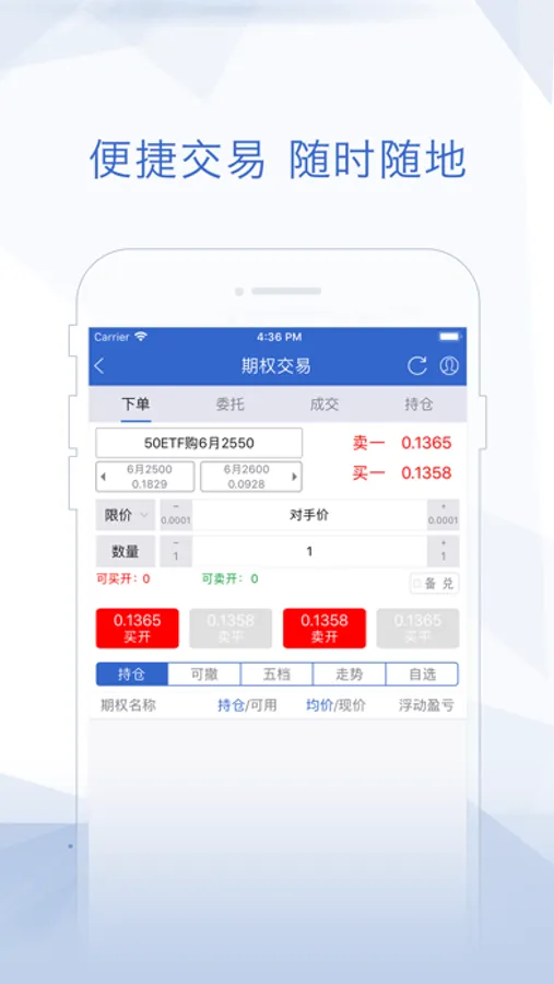 南京证券鑫易通期权交易平台手机版集期权行情展示与交易于一体,功能齐全,为客户提供了更方便快捷的交易方式,配备了合约筛选、盈亏分析、损益图展示、一键开仓、一键平仓等功能。欢迎广大期权投资者使用。