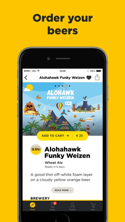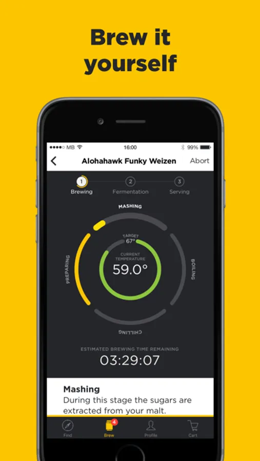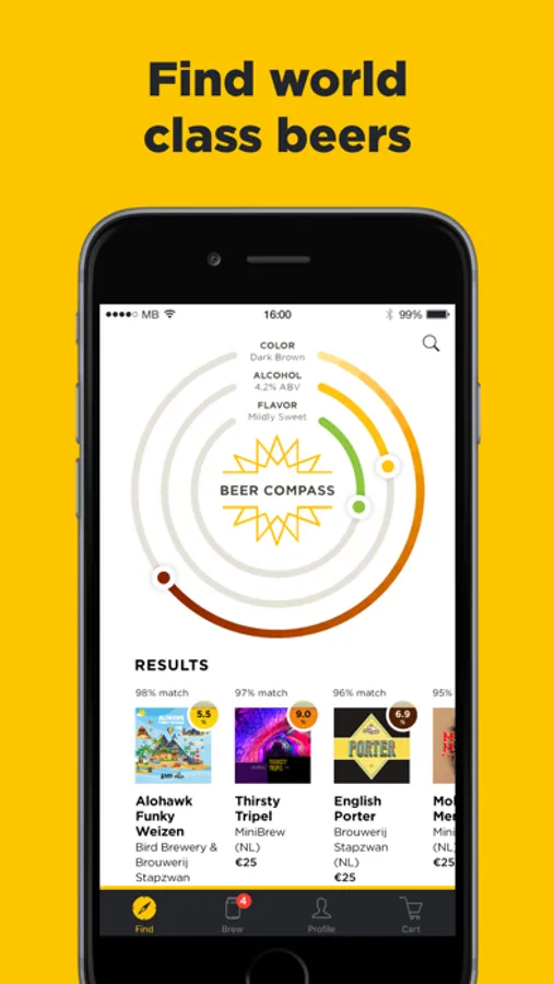 The MiniBrew app is the home of your craft brews. Use it to find the beer you want to brew, order your ingredient packs and start brewing.