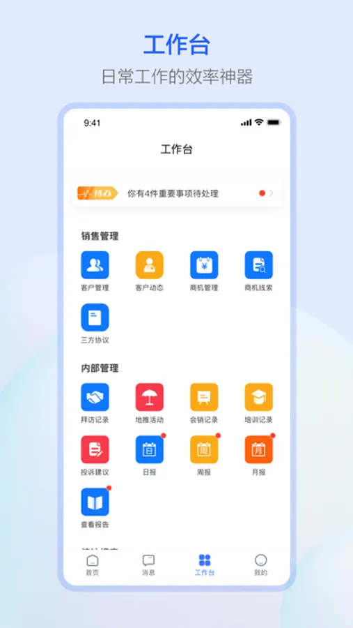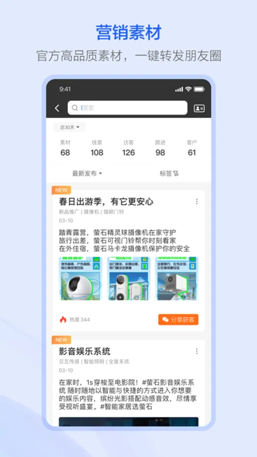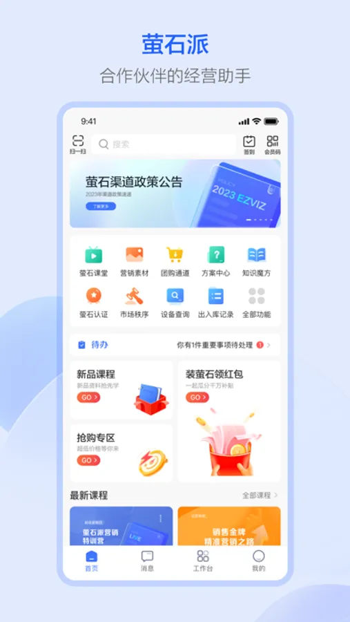 本产品服务于萤石的零售商、服务商、工程商,构建萤石产品、服务线上线下一体化,为萤石用户提供更加方便快捷的服务体验。萤石课堂和认证体系构建了萤石销售服务品牌化体系,让萤石的产品、销售、服务更有竞争力。客户关系管理系统提供了更方便的客户关系维系工具。消息模块可以让用户更加快捷准确的了解萤石产品信息、市场政策等。