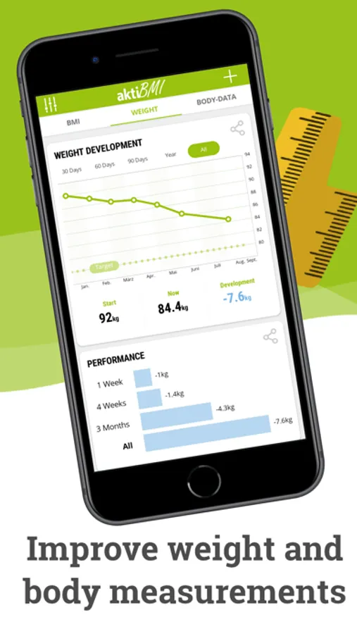 The APP provides you with a detailed body weight diary including graphical statistics on your body weight improvements. When updating your body weight, the App will track and comment on your achievements and continuously encourage you to improve. With the BMI calculator you can easily calculate your BMI (Body Mass Index) and find out from graphical interpretations whether you are overweight, underweight or have normal weight.