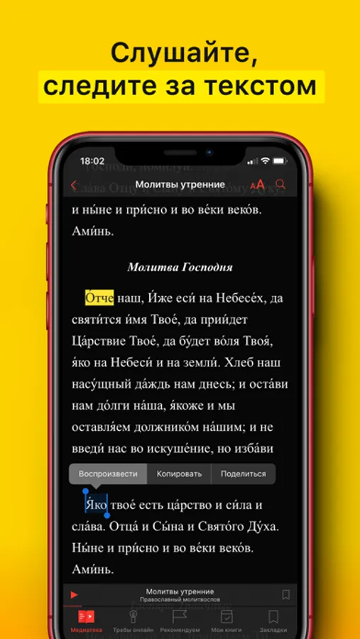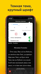 ・ Читаемый текст подсвечивается — возможность слушать и читать одновременно, понимая слова и смысл богослужебных материалов;