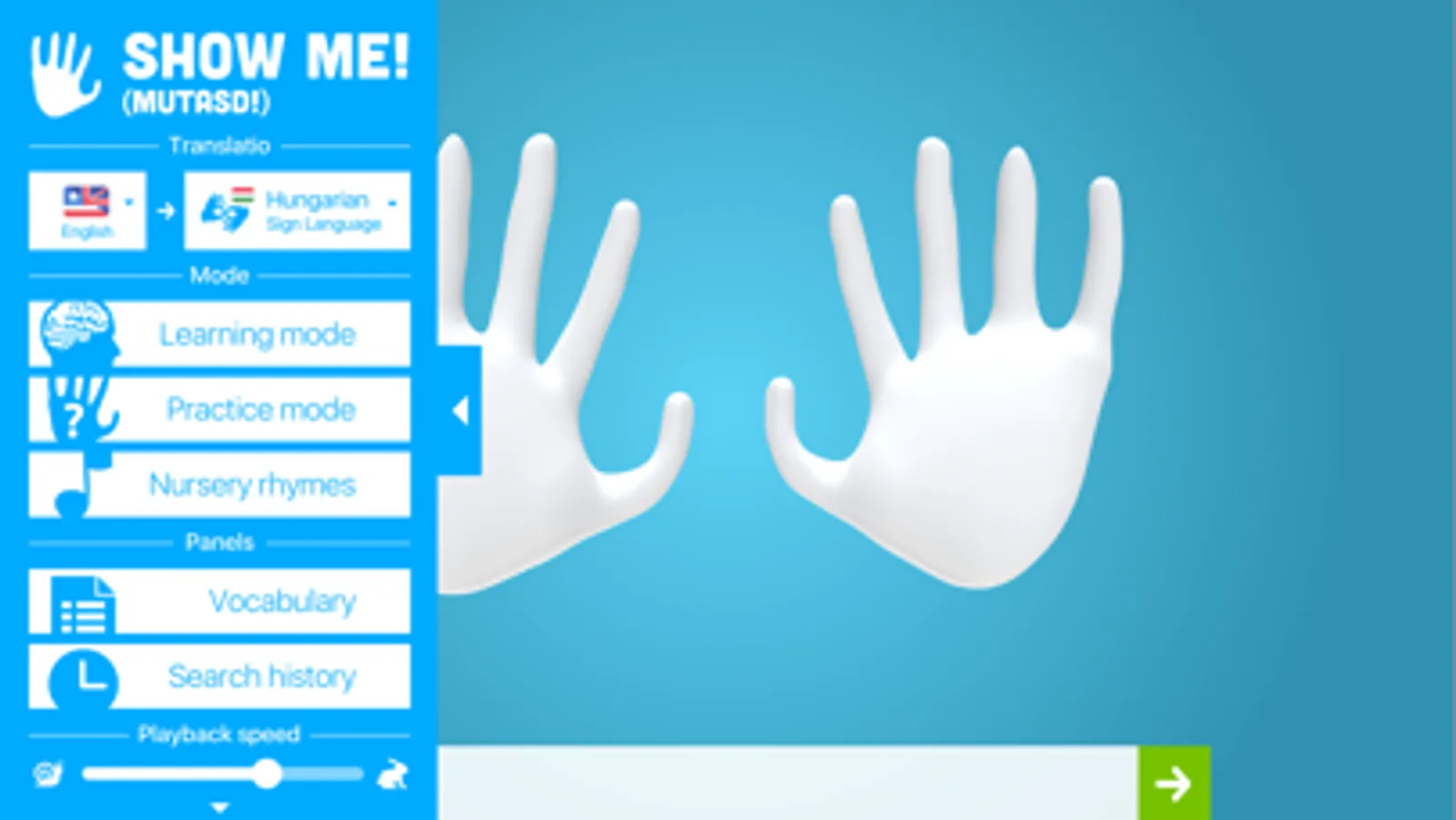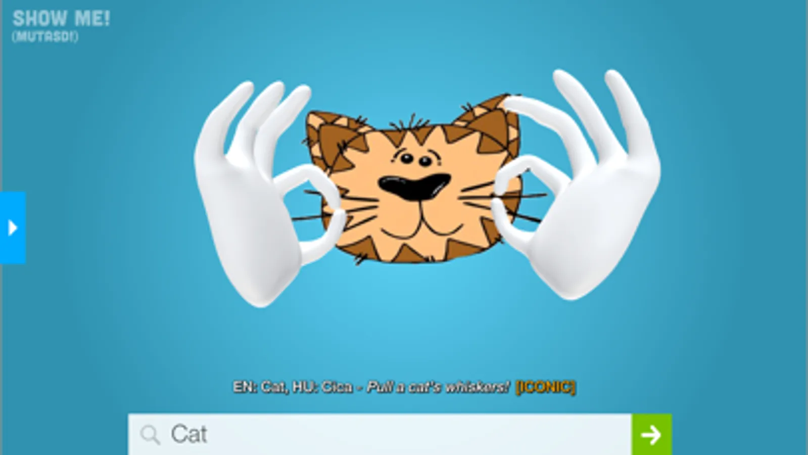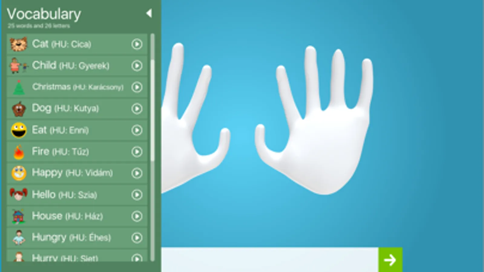 The concept is simple. Two virtual hands and an intuitive, user friendly and minimalist interface greet the user. The three-dimensional animated hands do the gestures corresponding to the word which the user types into the search bar. If the app doesn’t recognize the word, the hands do the gesture for each letter of the input, one by one, based on Fingerspelling. Cheerful images appear behind the hands, which help memorizing the gestures and which are appealing and engaging to the younger audience.