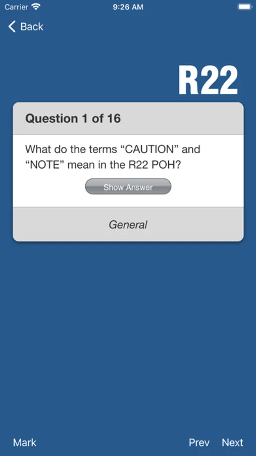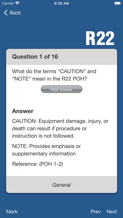 Nearly 400 flashcards are based on Sections 1-8 of the R22 POH. Topics include general information about the aircraft, as well as limitations, normal and emergency procedures, performance, weight and balance, maintenance, helicopter-specific IFR rules and regulations, and a section with special emphasis on R22 systems.