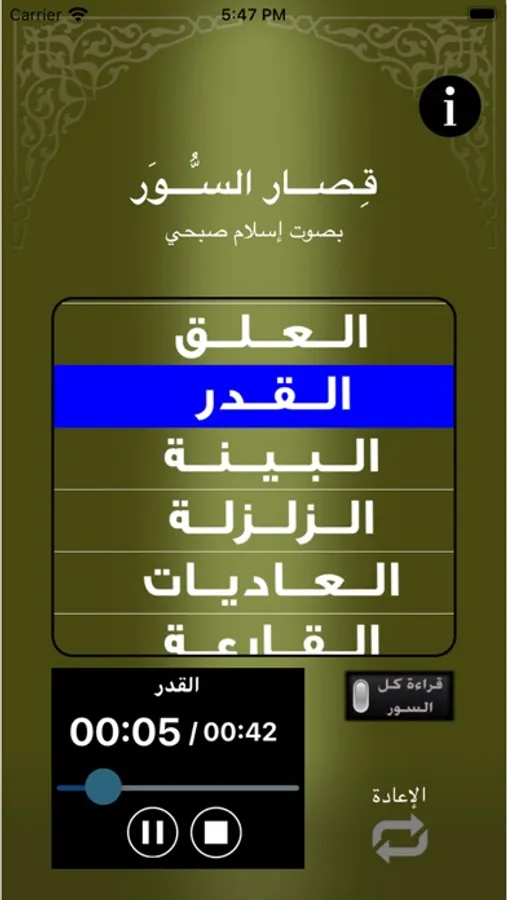 التطبيق سهل الإستخدام و يمكنك من إعادة تلاوة السورة تلقائيا للمساعدة على حفظها.