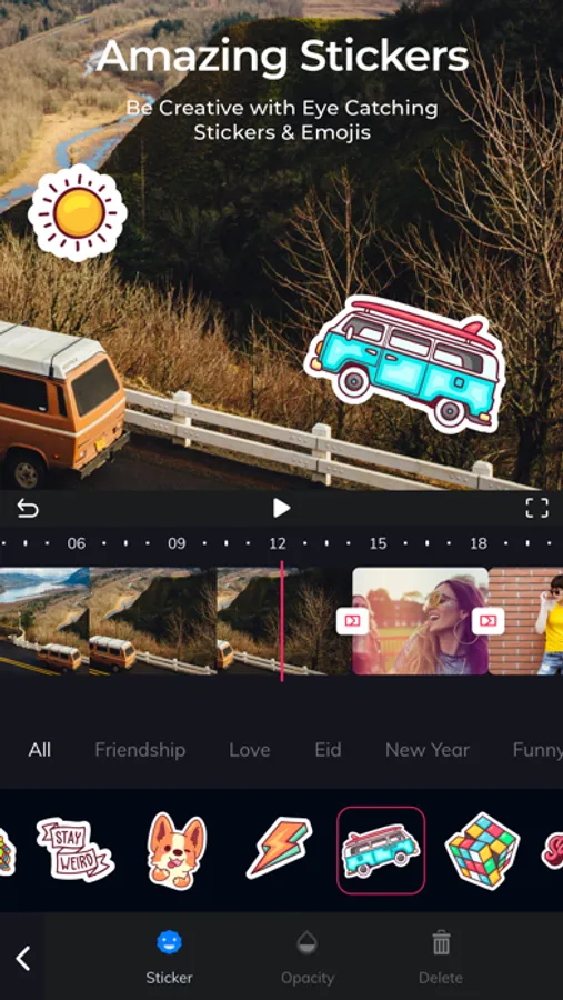 • Add fonts, emojis, stickers, etc from multiple categories.
