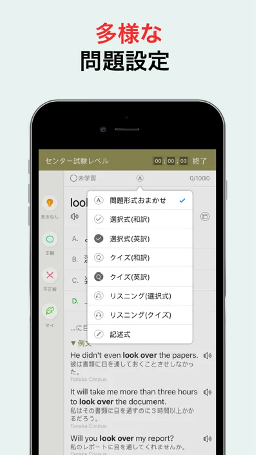 選択式、クイズ式、リスニング、記述式など英単語の習得状況に応じて出題。「分かった」「分からない」をタップするだけで簡単学習!