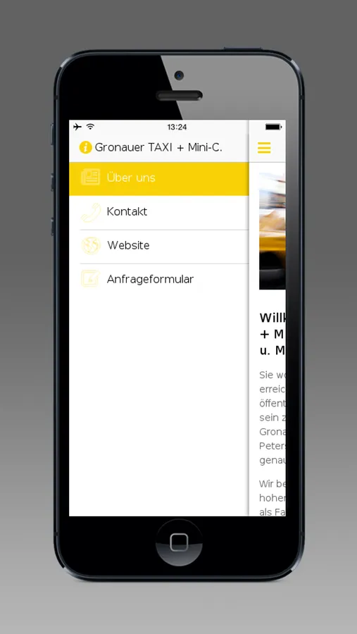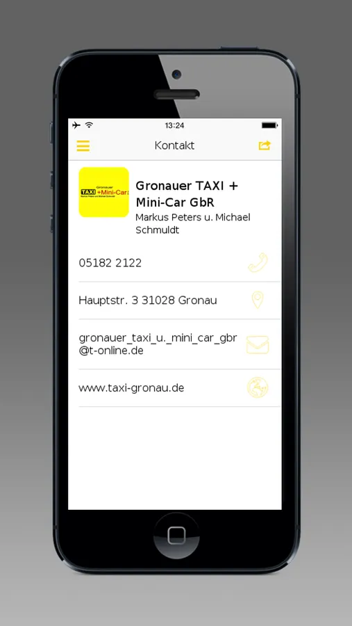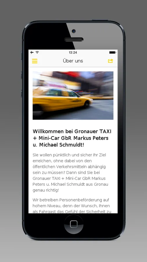 Holen Sie sich unsere offizielle Gronauer TAXI + Mini-Car App! Informieren Sie sich mobil über unsere Dienstleistungen und stehen Sie immer in direktem Kontakt zu uns. Sie sind mobil - und wir sind es ab sofort für Sie auch!