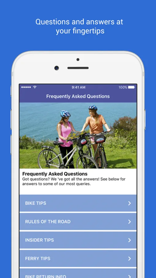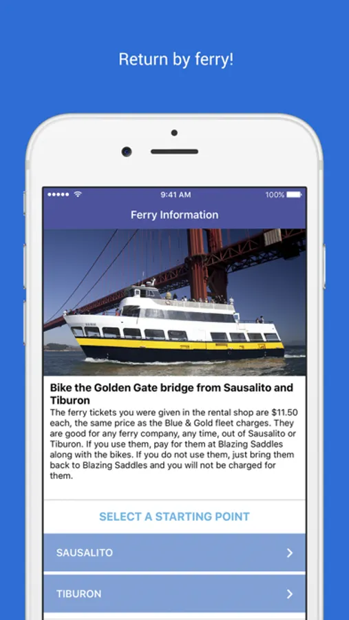 When you’re done with the fun, you can cycle back or bring your bikes on the ferry boat to return to San Francisco. Inside the app you’ll find the full ferry schedule, including arrival times and location, plus bike return information and Frequently Asked Questions.