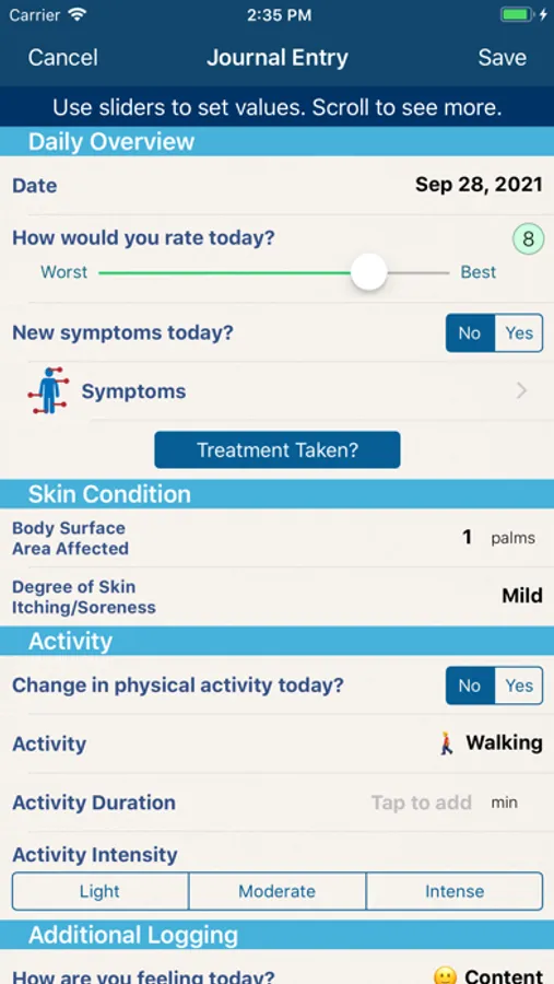 • Track your progress and symptoms by filling in the daily journal with its sliders and buttons and watch your data transform into easy-to-read charts