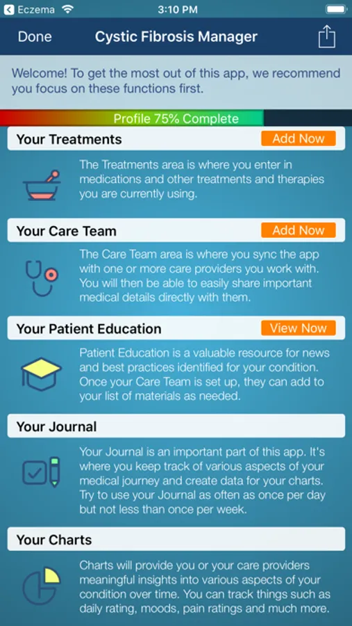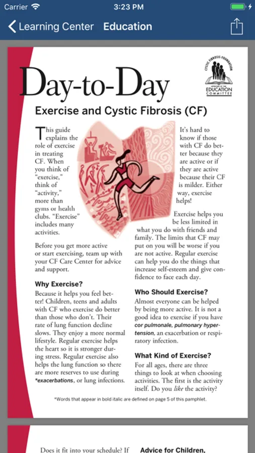This valuable management tool enables patients with Cystic Fibrosis (CF) to track and store relevant health information between clinician visits.