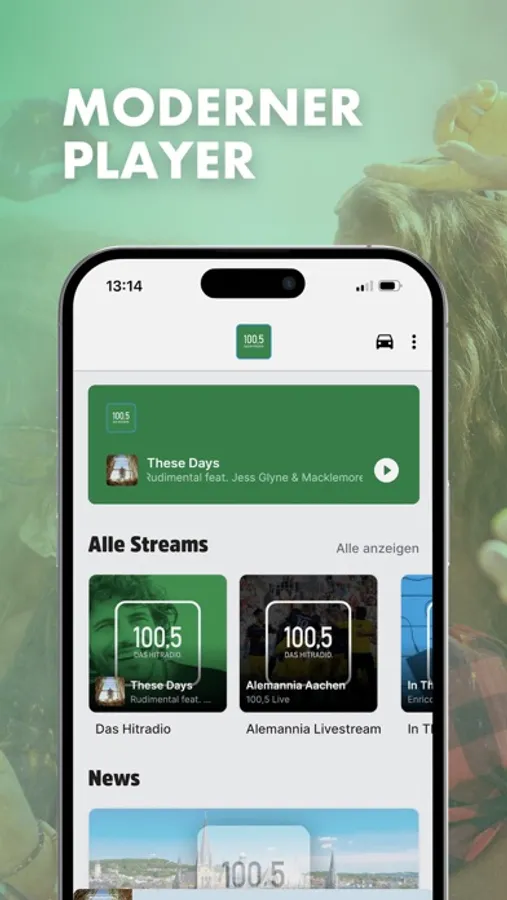 Die 100,5 DAS HITRADIO.-App ermöglicht es Dir, das Programm von 100,5 DAS HITRADIO. im Livestream zu hören, aktuelle News zu lesen und die Playlist zu durchstöbern.