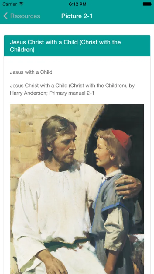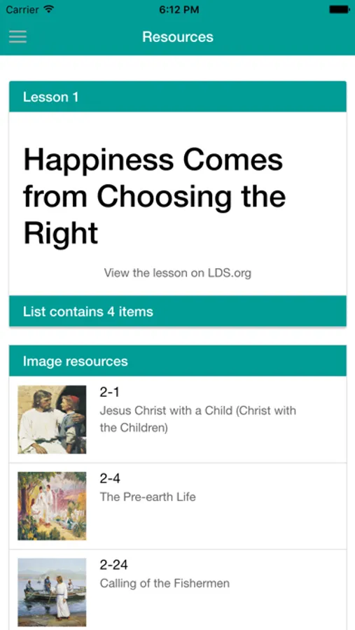 Lessons: The Lessons show a link to the lesson on LDS.org, all the resources available for the lesson including title and thumbnail, and the external resources for the lesson. To view a specific resource details just tap the item in the list.