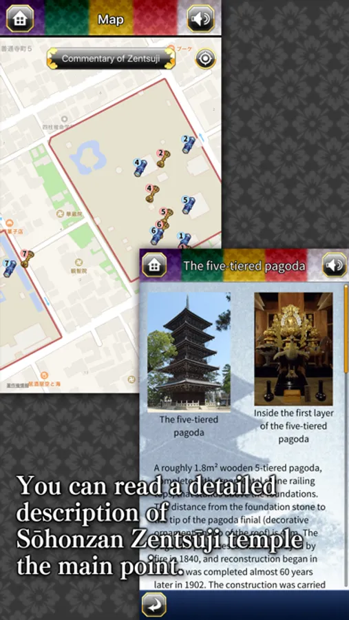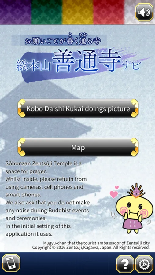 An application that uses AR technology to present the charm of Sōhonzan Zentsūji Temple. This is "The Temple of Answered Prayers - Sōhonzan Zentsūji Temple Navi". Read various commentaries on Zentsūji Temple, and use AR technology to recreate the finer details to more deeply understand the temple. In addition, you can enjoy "The Life of Kōbō-Daishi Kūkai - in pictures," a biography of the Japanese monk created for the Kagawa Prefecture Zentsūji First High School Department of Design Graduation Ceremony 2012. Together Mugyu-chan to be Zentsuji City tourism ambassador can also AR commemorative photo. Download "The Temple of Answered Prayers - Sōhonzan Zentsūji Temple Navi" and go and visit the real Sōhonzan Zentsūji Temple.