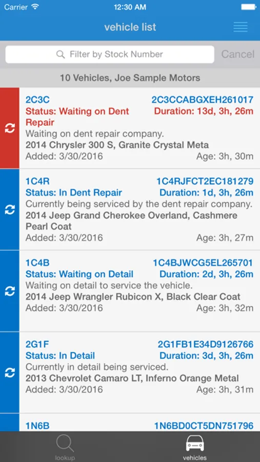 Seeing how long a vehicle is in any process is a breeze as each vehicle displays time in process in easy to read language such as 4d, 6h, 43m. Vehicles that are too long in process change colors and show easy to see icons to help easily see problematic vehicles in a list.