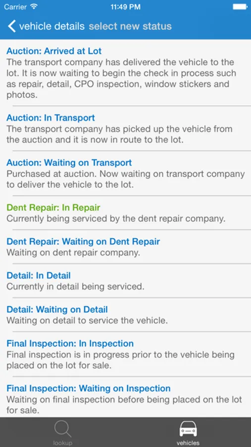 Status changes can also notify parties via email when a vehicle is assigned a status, so that vendors and employees can be notified that a vehicle is waiting on them to process. They can also easily use the app to see what vehicles are assigned to a status that they are responsible for.