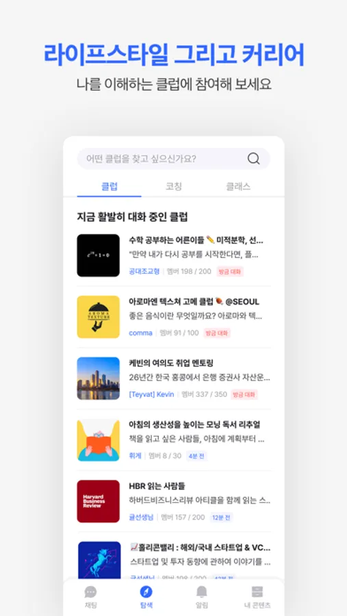 재테크와 커리어부터 운동과 취미까지. 200여가지가 넘는 클럽 중 나에게 딱 맞는 곳을 발견해보세요.