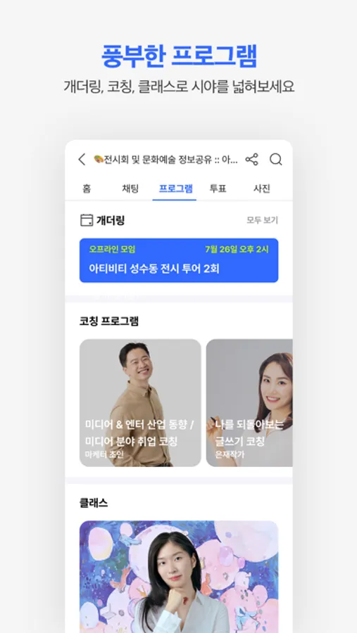 각 클럽에는 이벤트, 코칭, 클래스 등 자기계발을 할 수 있는 다양한 프로그램이 준비되어 있습니다.