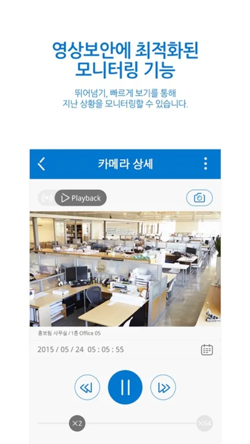 건너뛰기, 빠르게 보기 등의 모니터링 기능으로 고객님의 CCTV에 찍힌 지난 상황을 재생해볼 수 있습니다.