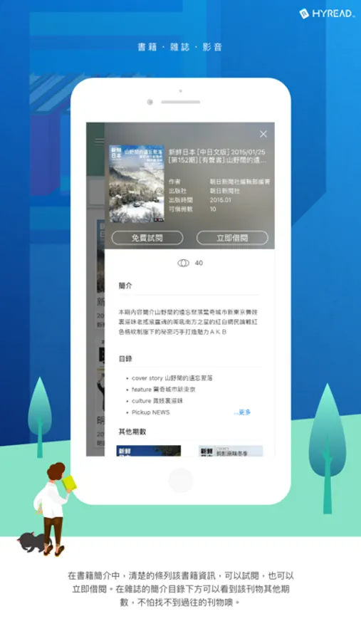 * 提供免費試閱,立即借閱,預約登記、雜誌上架主動通知服務