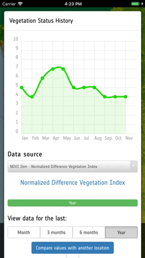 The raw NDVI values are normalized on a scale from 1 to 10 and are grouped in intervals that have meaningful names, such as "Healthy vegetation". All these data are linked with the photo taken by the user and stored for later visualization. A map with all the locations, as pinpoints, where photos were taken is also available. Brief information about the Proba-V mission and about general remote sensing of vegetation issues can also be browsed in the App.