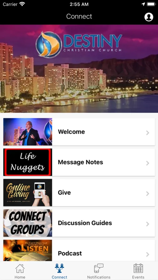 Our Destiny church app is now available for smart phones in the app store. Download it today to access audio sermons, bulletins and fillable message notes, go over Connect Group Discipleship Guides, view our social media, submit a prayer request, or share your testimony!