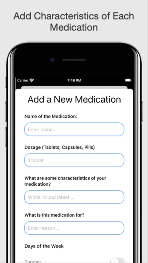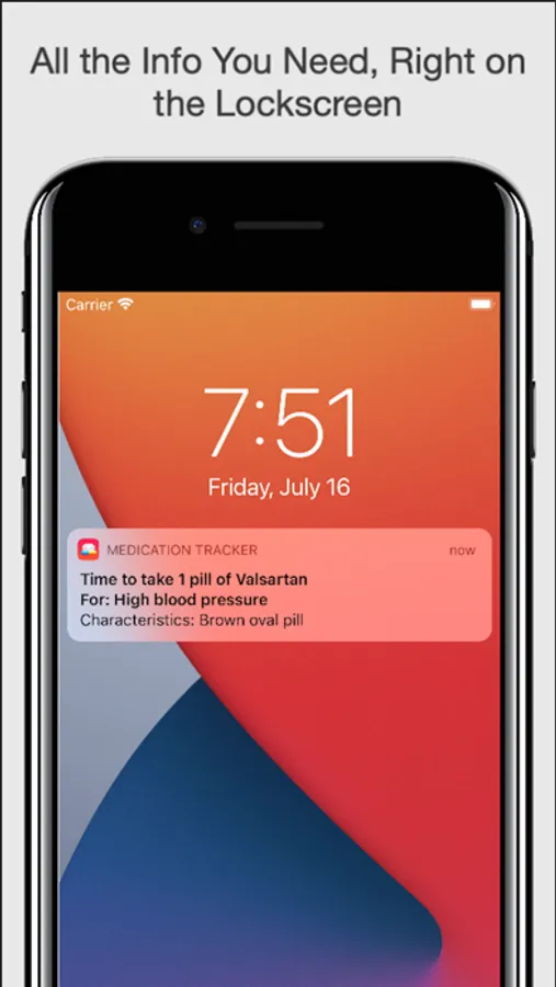 Receive timed notifications with the name, dosage, reason for and characteristics of the medication. All the info you need, right from the lockscreen - No need to open the app.