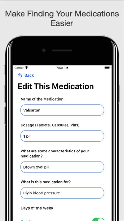 The app was designed in consideration of the elderly who often have many medications. Medication Tracker makes it easier to remember to take medications and to find the correct one.