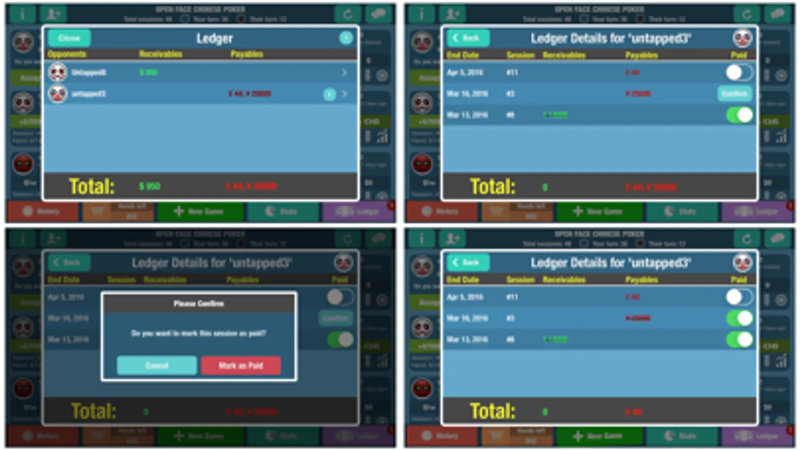 Here you can track the results (winnings or loss) and the status on payments (receivables or payables) of all the finished sessions with all your opponents.