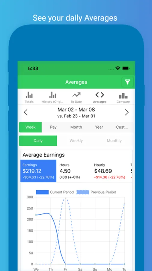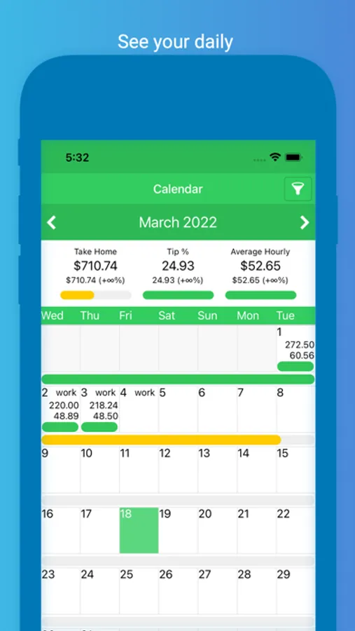 Enter your earnings at the end of your shift and easily see your totals. You'll be able to clearly see which days pay the best with our powerful filtering and comparison logic.