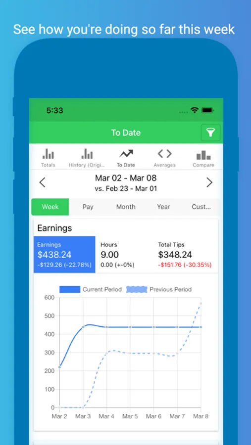 The History page will show you the total tips and wages you earned for the any week, 2 weeks, semimonthly, month and year.