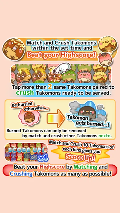 Rule is very simple, Tap 2 same Takoyakies to Crush them!