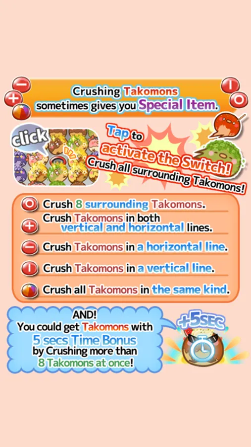 Each time you crush more than 10 same Takomons, will get Score Bonus.