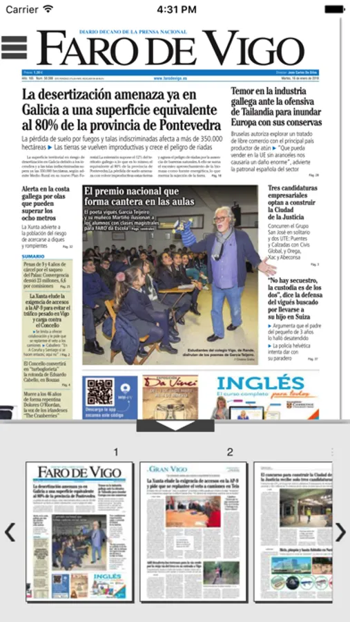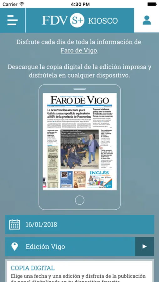 Acceso a la edición digital del Faro de Vigo. Publicación diaria de la versión digital de las ediciones impresas. Incorporación de elementos multimedia y acceso a últimas noticas por RSS.