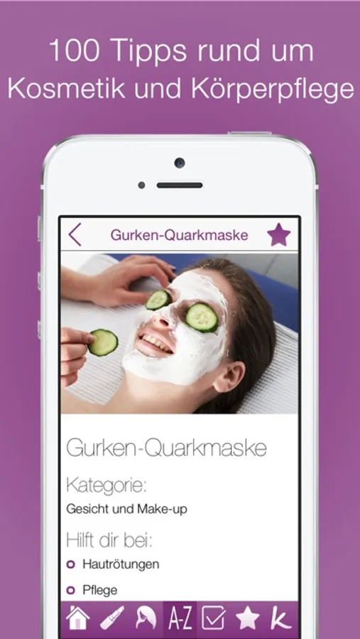 Ob Badezusatz oder Make-up-Entferner, hier erfährst du, wie du dir deine Pflegeprodukte selbst herstellen und sofort anwenden kannst. Die Zutaten hast du in der Regel sowieso zuhause. Einschließlich der bekannten Gurkenmaske findest du in unserer App 100 nützliche Tipps und Tricks, nicht nur für die Haut, sondern auch für Haare und Fingernägel. Alle Kosmetikstipps sind einfach und schnell anwendbar und sparen nicht an praktischen Hinweisen.