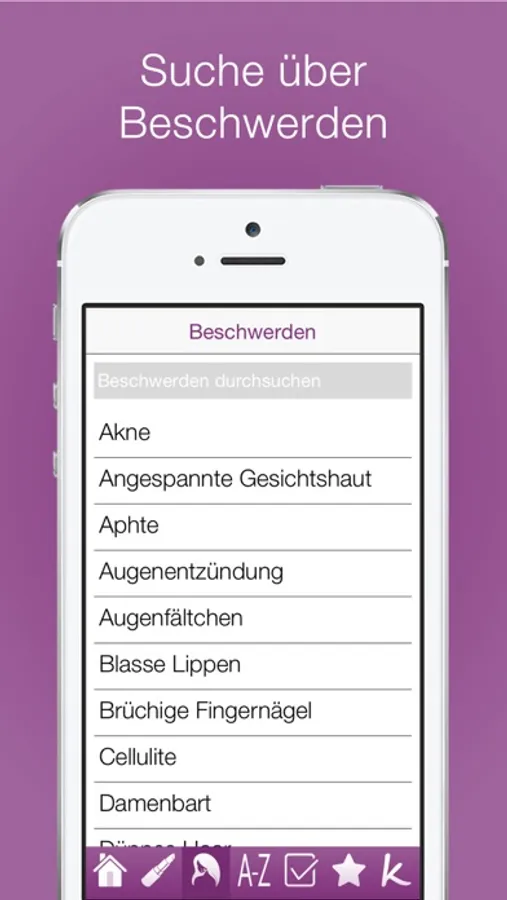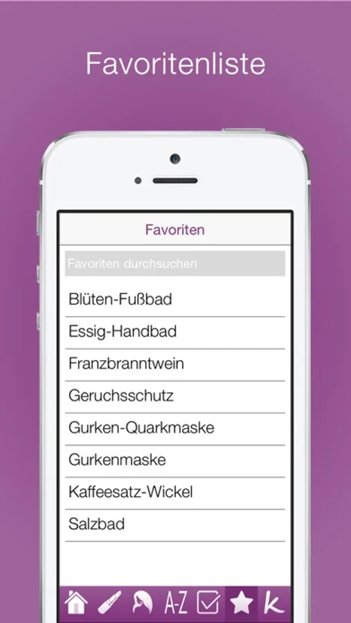 Mit der Suchfunktion kannst du gezielt nach der Lösung für ein konkretes Problem suchen. Du kannst dir die Tipps aber auch nach verschiedenen Anwendungsbereichen sortiert durchschmökern. Fehlt dir einmal eine Zutat, kannst du diese markieren und damit direkt auf eine interaktive Zutaten-/Einkaufsliste setzen. Und indem du die Tipps, die du am häufigsten benötigst, als Favoriten markierst und dir Notizen dazu machst, kannst du dir deine ganz persönliche Kosmetik-App gestalten.