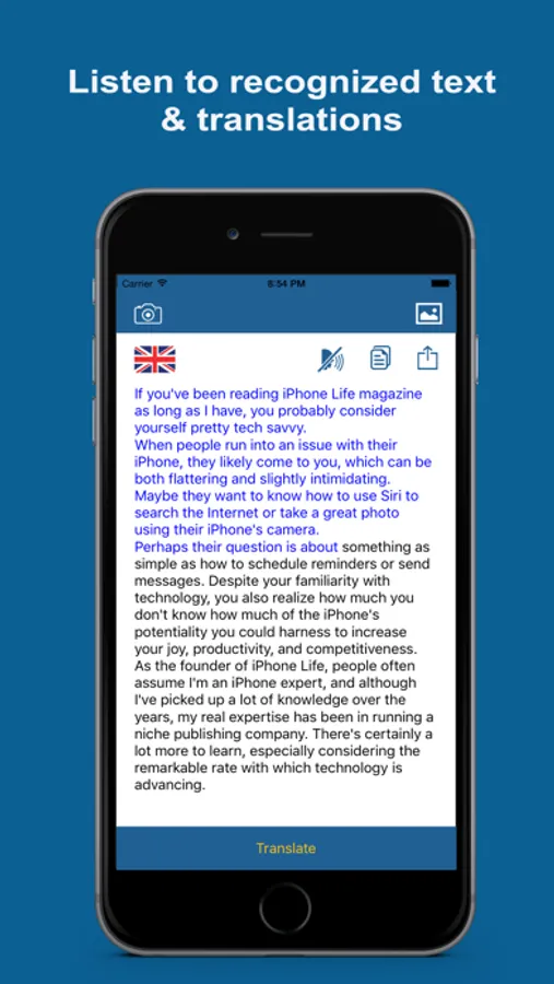 Text Extractor & Translator is the ultimate solution for all these situations. Just hold your device's camera at the printed material and the app will instantly capture , extract , translate and read out the text !