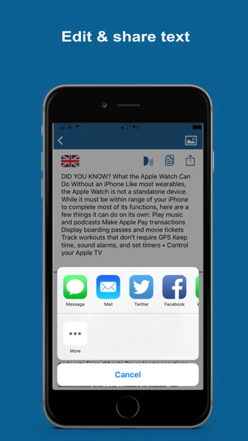 Extracted text ,translated text and also captured images can be shared via email, messages and social media.