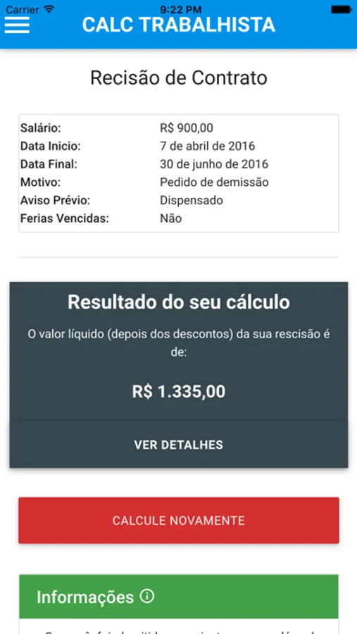 App oferece uma simples simulação e está sendo validado com contadores seguindo as regras 2016 CLT