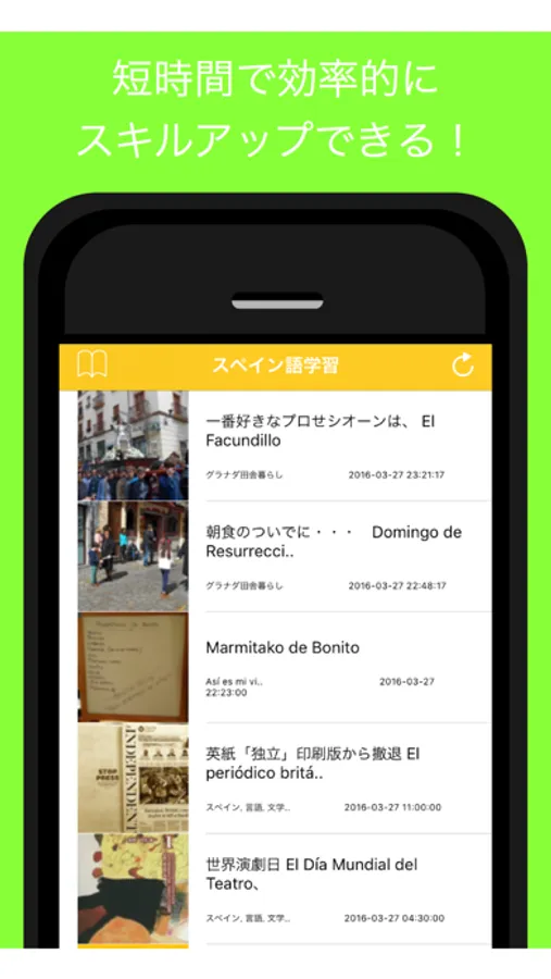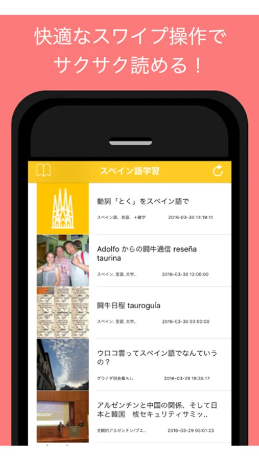 シンプルでわかりやすいUIと簡単操作でサクサク読めるスペイン語学習に特化した無料の学習アプリです。