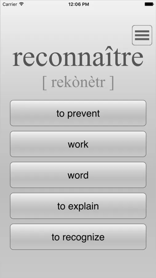 The program displays a random French word, along with its variants and a translation into English (or Russian). A pronunciation guide will also appear under the word to help you learn to say it correctly. The program will keep showing you each French word, until you succeed in learning it. The app considers that you’ve internalized and learned a word after you’ve translated it correctly five times in a row, and will then take that word out of the learning cycle.