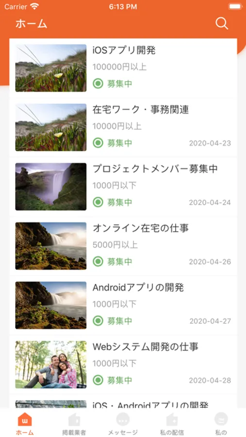 アプリ内では、オンライン在宅勤務・テレワークなどの募集情報の配信機能や応募機能を備えています。募集情報を配信したい場合は、業者情報の登録をしてから、募集要項を作成して、配信してください。