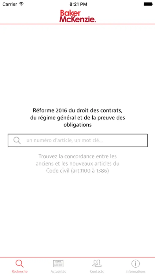 Baker McKenzie Réforme Contrats 2016 est une App gratuite, pour smartphone et tablette, développée par le Cabinet d’avocats Baker McKenzie pour ses clients et amis à l’occasion de la mise en œuvre de l’Ordonnance n° 2016-131 du 10 février 2016 « portant réforme du droit des contrats, du régime général et de la preuve des obligations » (« l’Ordonnance »).