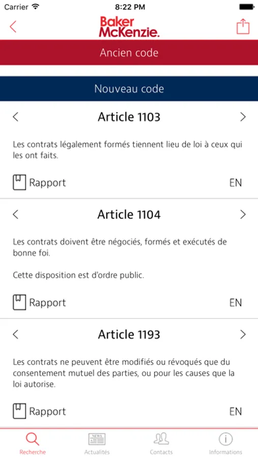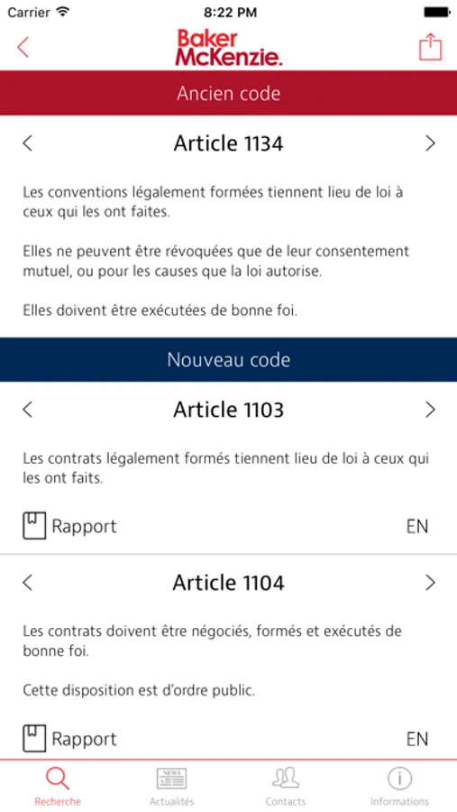 Ainsi, avec Baker McKenzie Réforme Contrats 2016, vous pouvez facilement trouver la concordance entre les anciens et les nouveaux articles concernés du Code Civil français. Vous pouvez de plus, si vous souhaitez contextualiser et approfondir les changements apportés par la réforme, consulter les sections pertinentes du rapport au Président de la République publié le même jour (JORF du 11 février 2016).