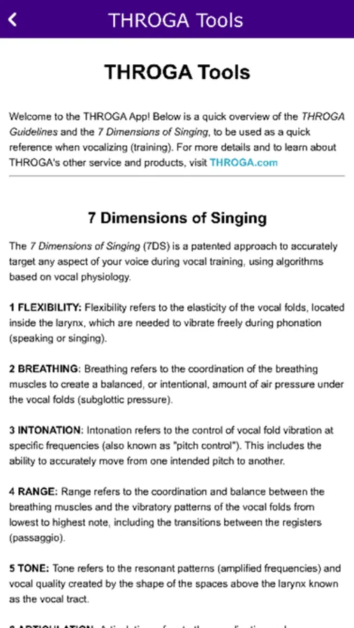 - THROGA TOOLS: Reference guide to the 7 Dimensions of Singing and THROGA Guidelines to maximize your vocal practice time.
