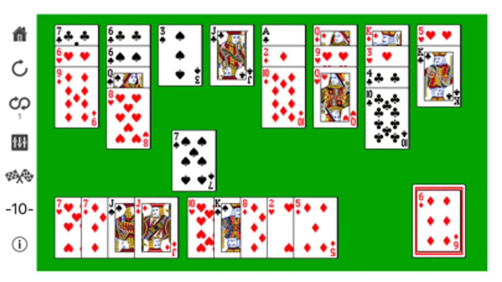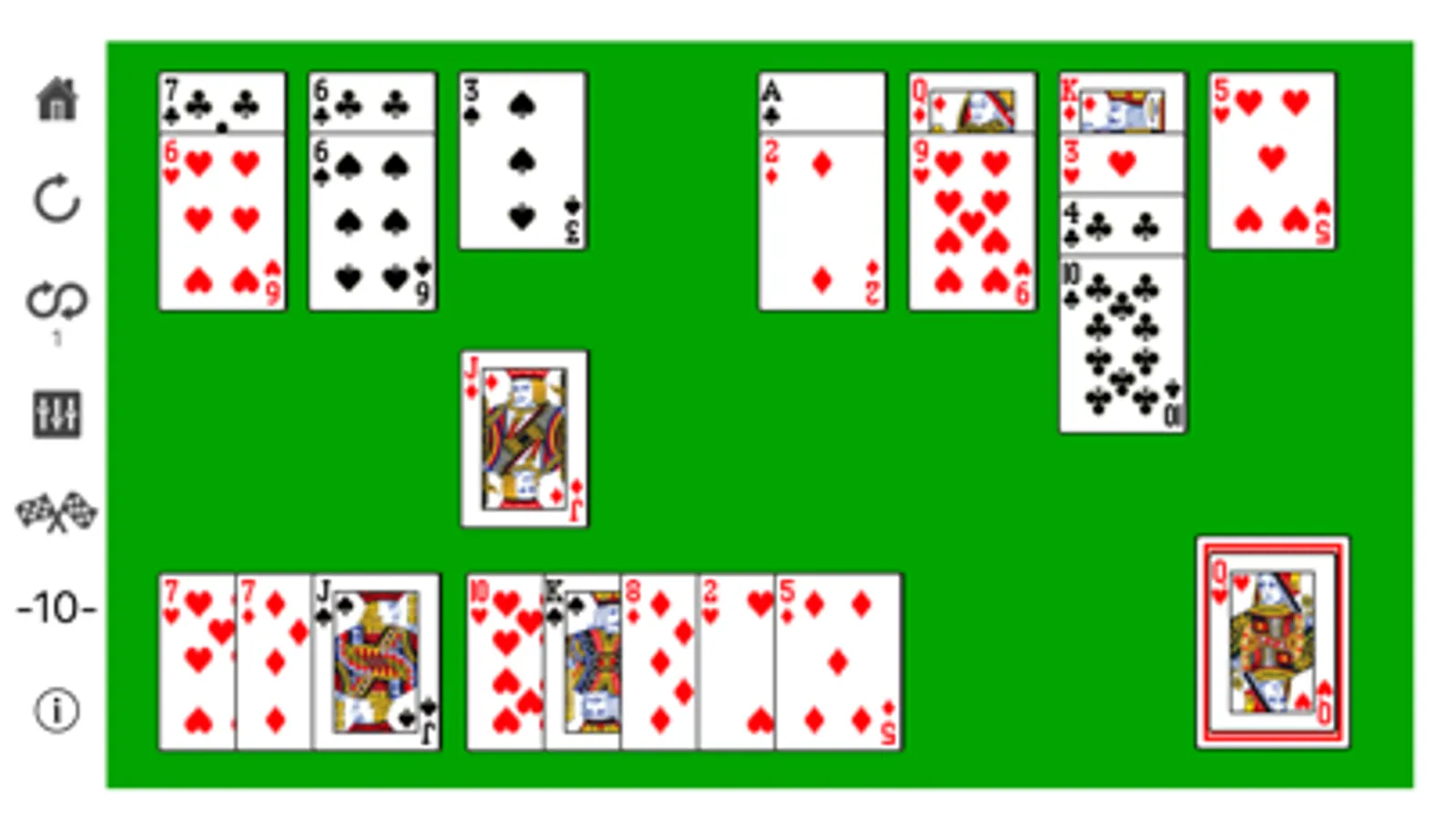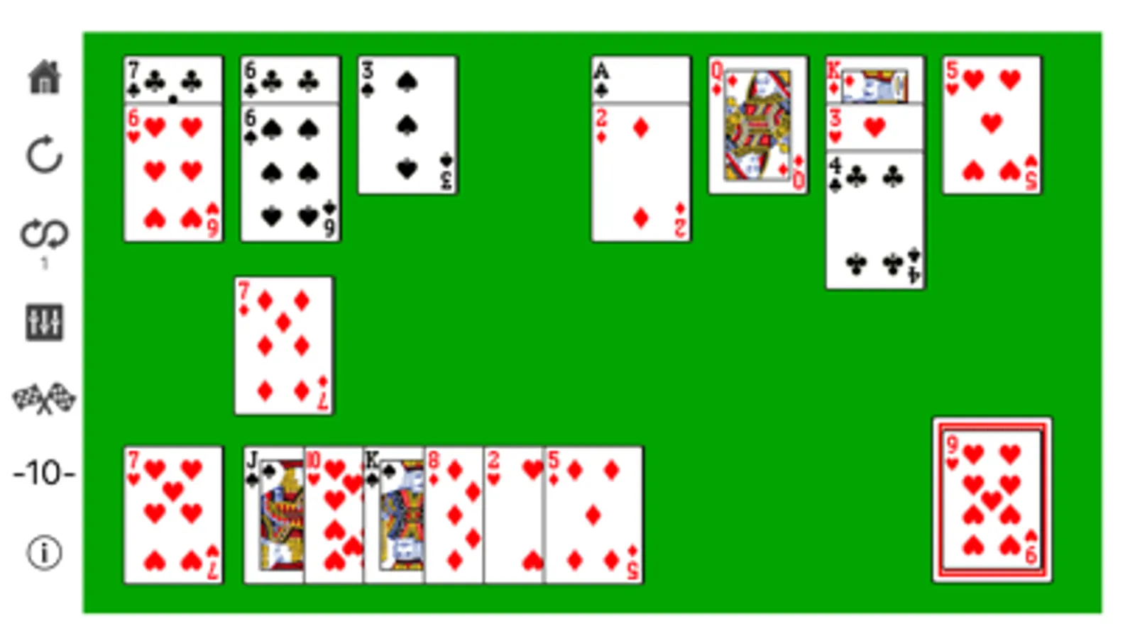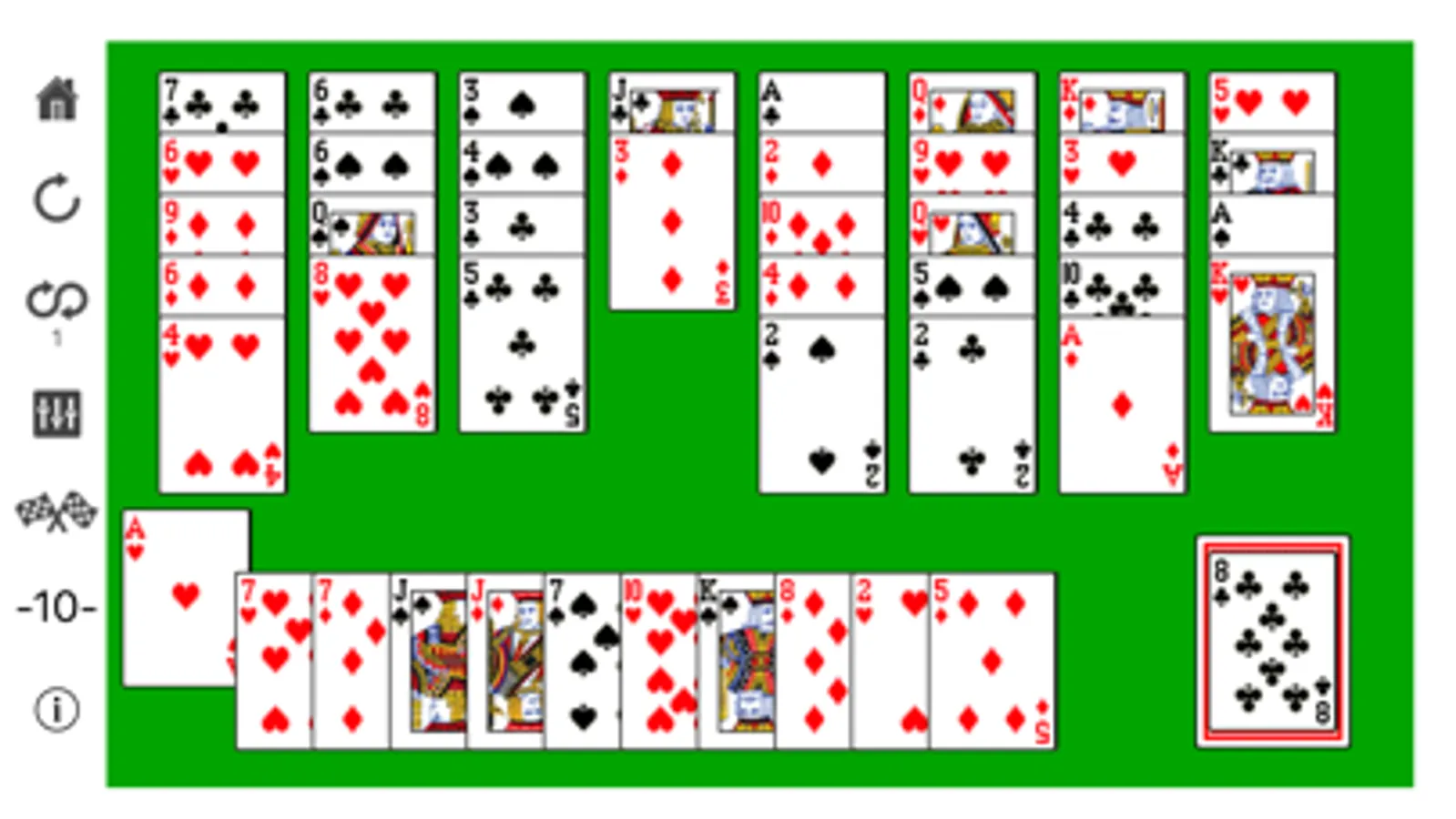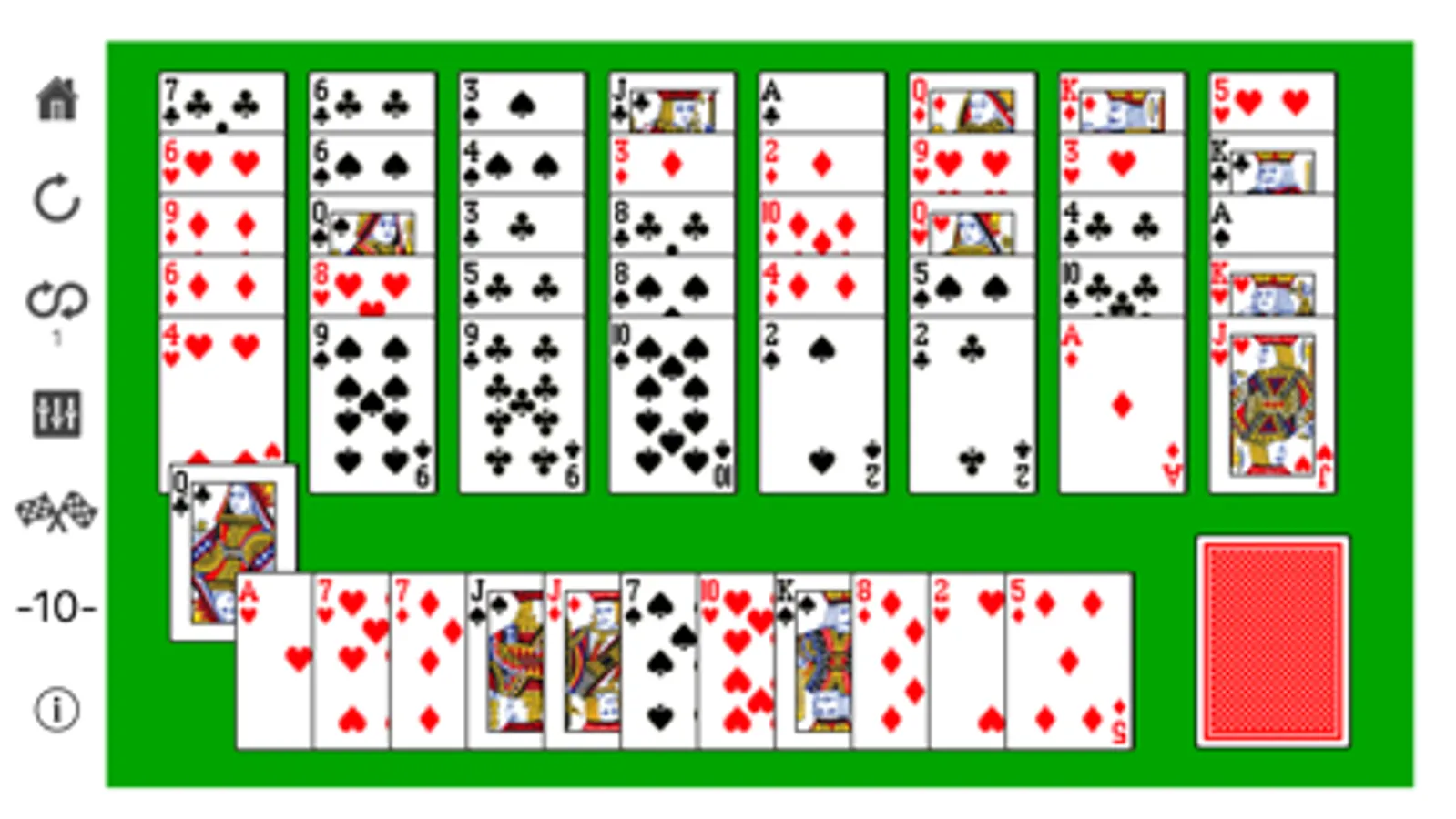 The free version of Forty Twelve includes both an 8 column and a 10 column game that can be played with 10 randomly shuffled decks. An upgrade, available through an In App Purchase, expands the number of decks to 100,000 and adds the more difficult 6 column and 7 column games.