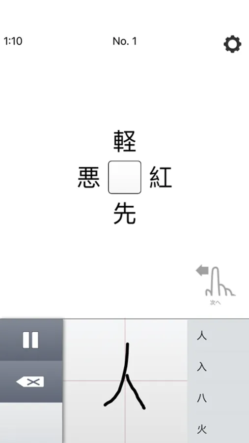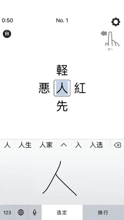 アプリ独自の手書き入力です。キーボードなどの設定はする必要がありません。すぐにゲームを楽しめます。(ただし標準キーボードによる手書き入力に比べると認識率は低いです。)当てはまる漢字を画面下のパッドに、大きくはっきり手書きしてください。(小さい文字ですと認識率が下がります。)手書き入力を元に20個の漢字が候補として右側のリストに表示されます。その中から該当する漢字をタップします。(指で上下にスライドしていただければ、画面外の漢字も参照できるようになります。)