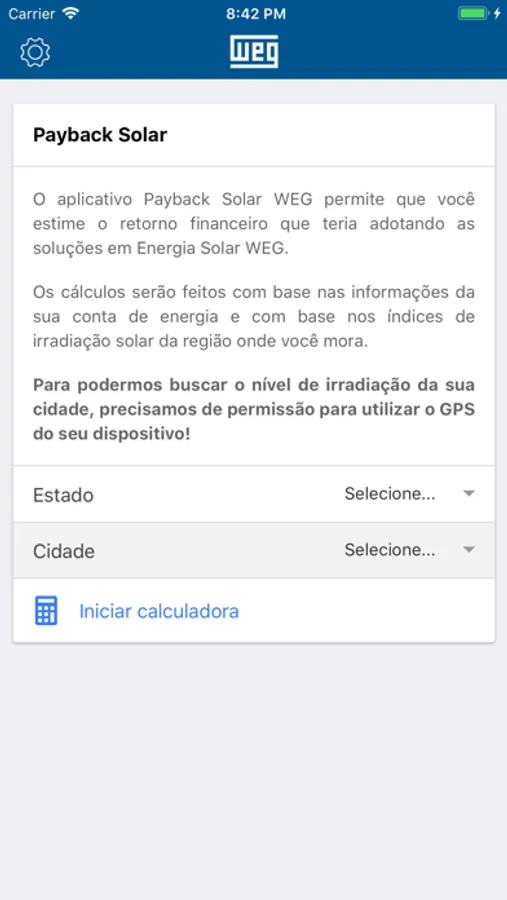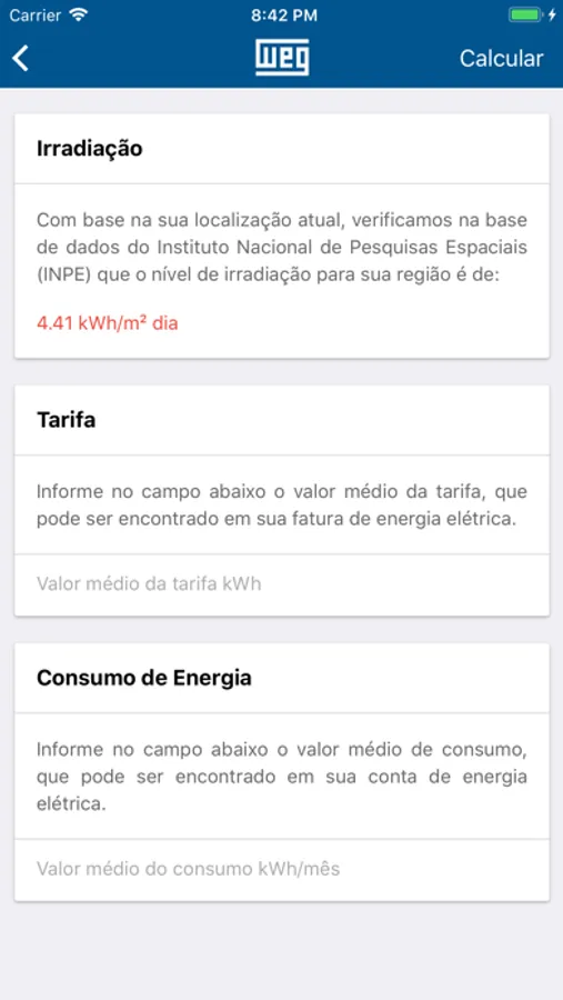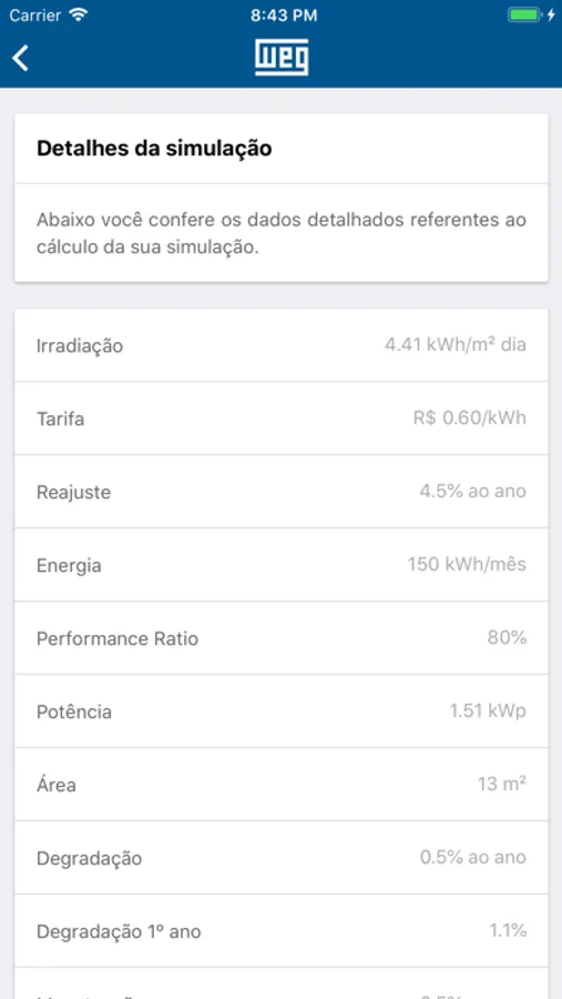 O aplicativo Payback Solar WEG permite que você calcule o retorno financeiro que teria adotando as soluções em Energia Solar WEG. Os cálculos serão feitos com base nas informações da sua conta de energia e com base nos indices de irradiação solar da região onde você mora.