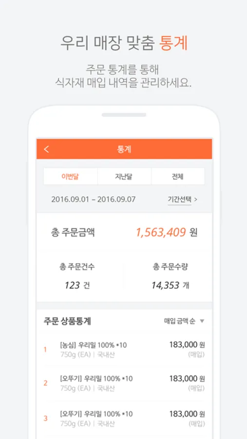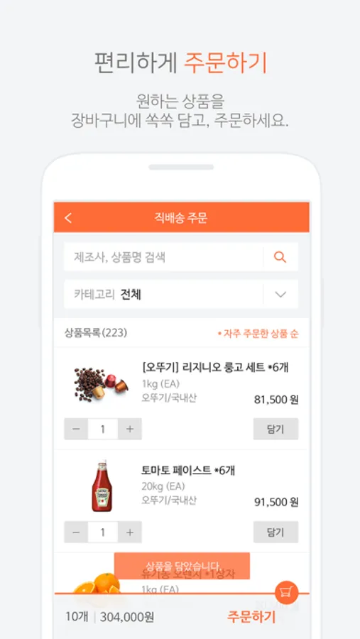 - 바쁜 점주님들을 위해 평소에 자주 주문하는 상품은 맨 위에 배치해놨어요.